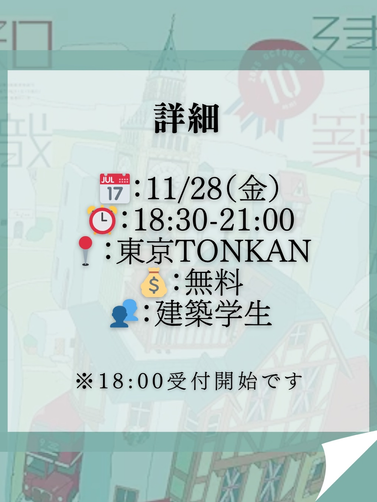社会人×学生 ご飯会建築系の企業に勤める社会人の方と気軽に楽しくお話ししましょう♪まだまだ業界を知らない低学年向けに丁寧に会社や建築業界の説明もしていただけます🌟🌟💡参加してくれた方には【建築知識11月号】をプレゼント‼️🎁毎月第四金曜日に開催するこのイベントに参加して全号集めよう💖